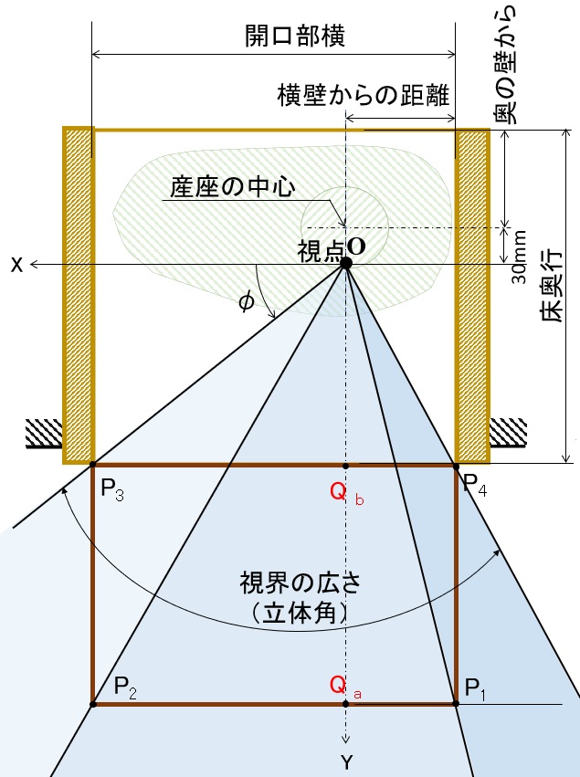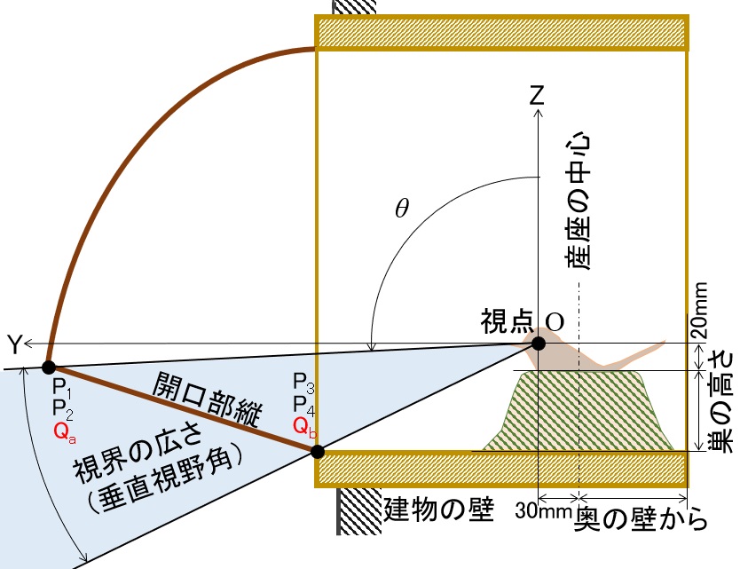 図2.典型的な換気扇フードの構造図.左は平面図、右は右側面図.開口部となっている四角形の頂点P1、P2、P3、P4が、親鳥の視点Oからの視界を制限しています.視界の広さを垂直視野角ないし立体角として評価しました.