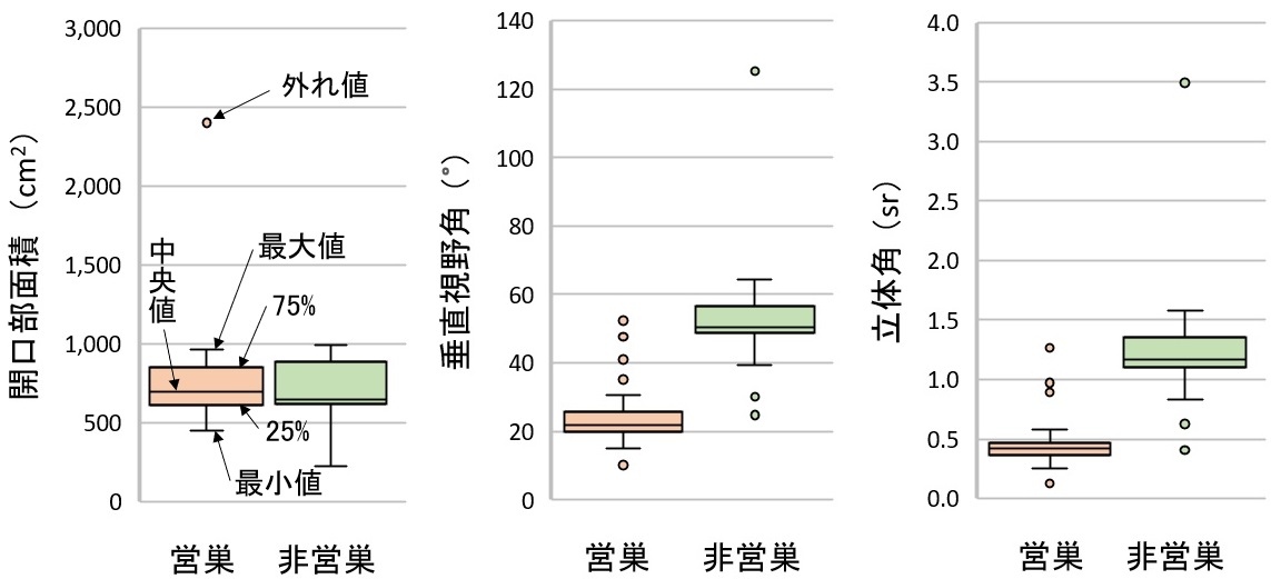 図3.営巣の有無による開口部面積、垂直視野角および立体角の箱ひげ図による比較.